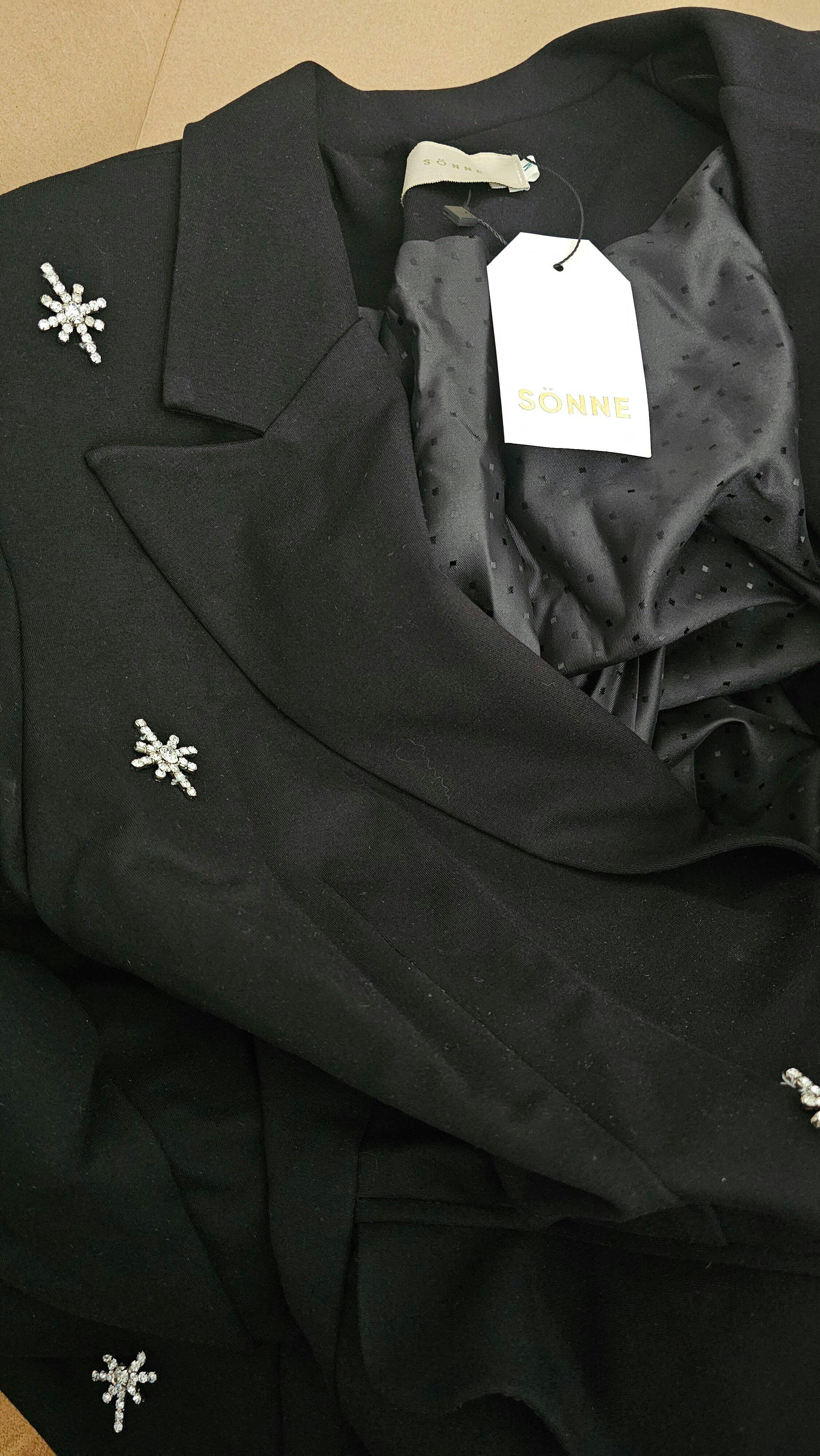 Las aplicaciones en forma de estrellas con incrustaciones brillantes tipo diamante iluminan la prenda con un carácter único, convirtiéndola en un statement piece que equilibra sofisticación y audacia.